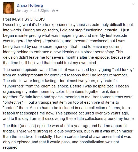 Last week, I had experiences which resembled an episode, except I would not categorize them as “psychotic”. I was making connections that may or may not have been real, but all along I was conscious that I was making those connections, and also aware that they may be delusions. I was able to choose which ones to act upon and which ones to ignore until later. Upon later reflection, I dismissed many of them as meaningless (at least for now).