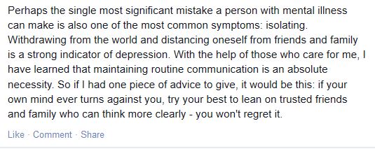There was a time (not so long ago) when I would have told you that I was sure of nothing – that I could not know anything for certain. This was because all that I had thought and believed was challenged when I came to understand that I had experienced psychosis. My faith in everything was shaken, and I feared I would be helpless in this way forever. Thankfully, I no longer feel that way – a combination of the right medications and the help of friends and counselors has given me the confidence to believe that my mind is not lost… it was only “reorganized” a bit. 🙂